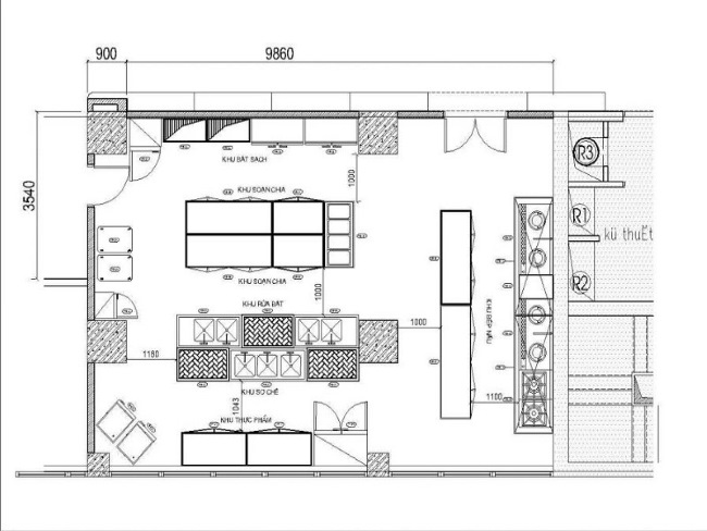 Bếp được chia thành các khu vực chính, kết nối chặt chẽ theo luồng công việc khép kín: