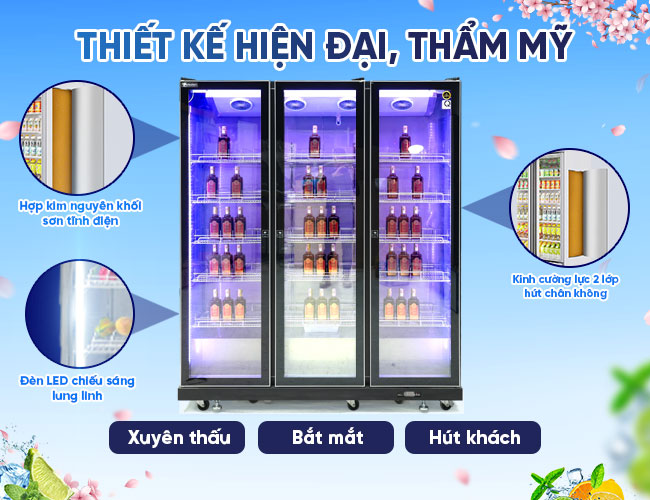 - Cửa tủ được làm bằng kính cường lực tích hợp công nghệ Low E, giúp giảm truyền nhiệt từ bên ngoài vào tủ, làm tăng khả năng giữ nhiệt, hạn chế đọng sương. Đồng thời, góp phần mang lại khả năng trưng bày bắt mắt, rõ nét hơn.