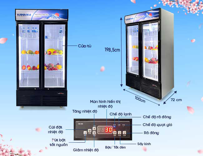 - Thiết kế dạng tủ mát đứng với kích thước tương đối (1000×720×1985mm)