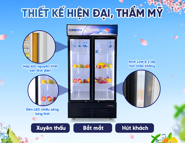 - Cửa tủ được làm bằng kính cường lực tích hợp công nghệ Low E, giúp giảm truyền nhiệt từ bên ngoài vào tủ, làm tăng khả năng giữ nhiệt, hạn chế đọng sương. Đồng thời, góp phần mang lại khả năng trưng bày bắt mắt, rõ nét hơn.