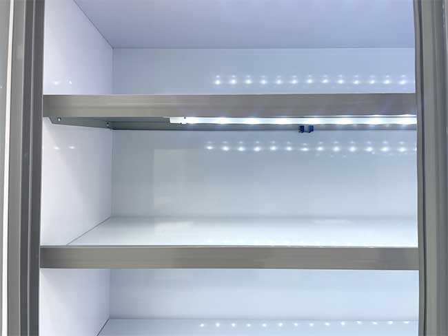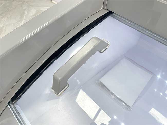- Cửa tủ được làm bằng kính cường lực tích hợp công nghệ Low E, giúp giảm truyền nhiệt từ bên ngoài vào tủ, làm tăng khả năng giữ nhiệt, hạn chế đọng sương. Đồng thời, góp phần mang lại khả năng trưng bày bắt mắt, rõ nét hơn.