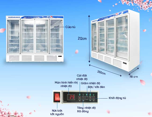 - Thiết kế dạng tủ mát đứng với kích thước tương đối (2500x780x2120 mm)