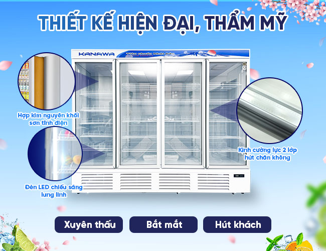 - Cửa tủ được làm bằng kính cường lực tích hợp công nghệ Low E, giúp giảm truyền nhiệt từ bên ngoài vào tủ, làm tăng khả năng giữ nhiệt, hạn chế đọng sương. Đồng thời, góp phần mang lại khả năng trưng bày bắt mắt, rõ nét hơn.